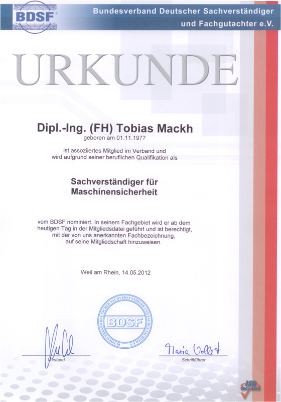 Urkunde für die Nominierung als Sachverständiger für Maschinensicherheit (BDSF)