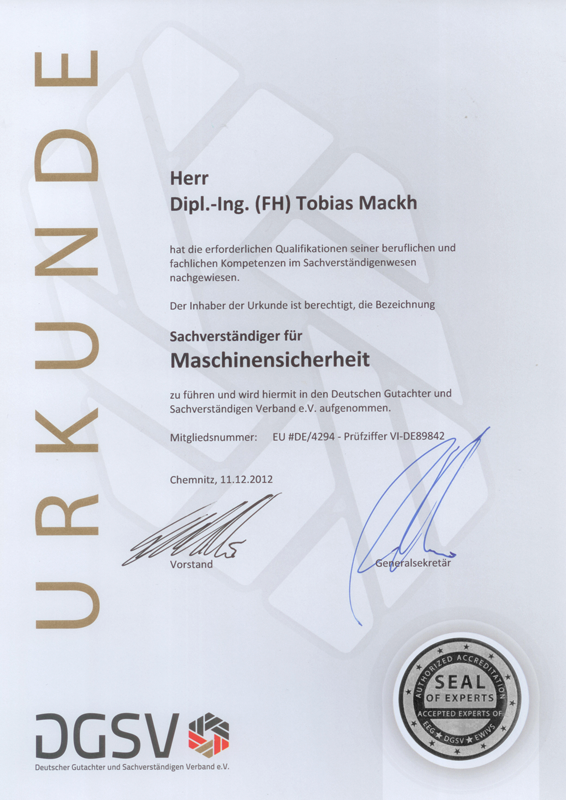 Urkunde Sachverständiger für Maschinensicherheit (DGSV)