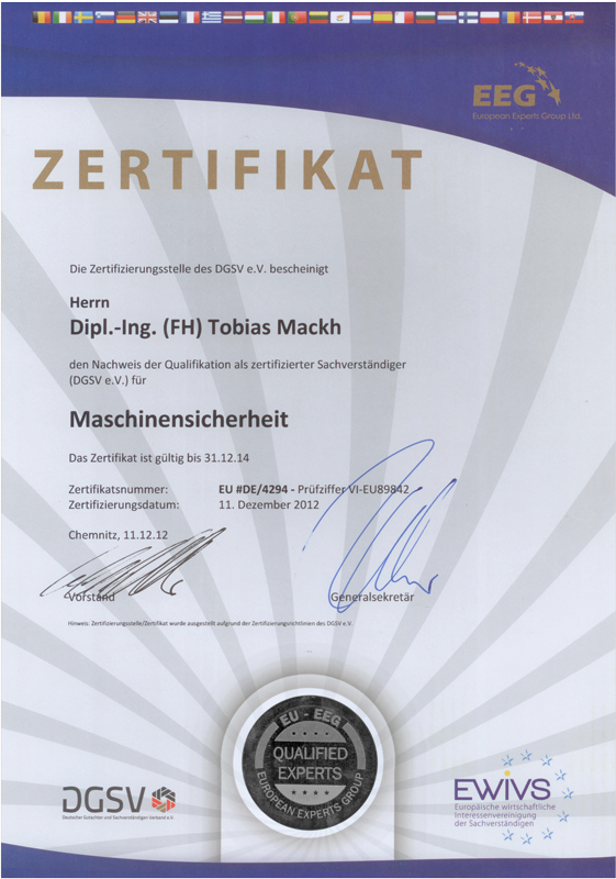 Zertifikat Sachverständiger für Maschinensicherheit (DGSV)